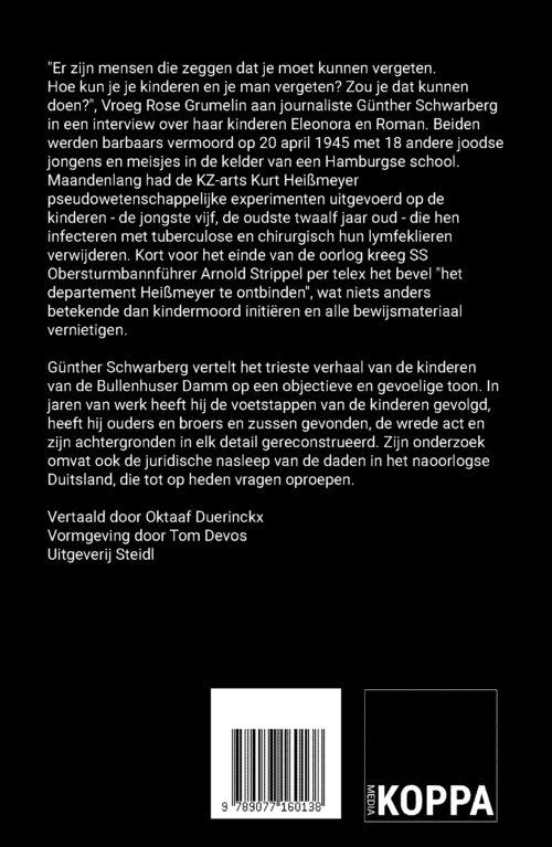 Günther Schwarberg vertelt het trieste verhaal van de kinderen van de Bullenhuser Damm op een objectieve en gevoelige toon. In jaren van werk heeft hij de voetstappen van de kinderen gevolgd, heeft hij ouders en broers en zussen gevonden, de wrede act en zijn achtergronden in elk detail gereconstrueerd. Zijn onderzoek omvat ook de juridische nasleep van de daden in het naoorlogse Duitsland, die tot op heden vragen oproepen.